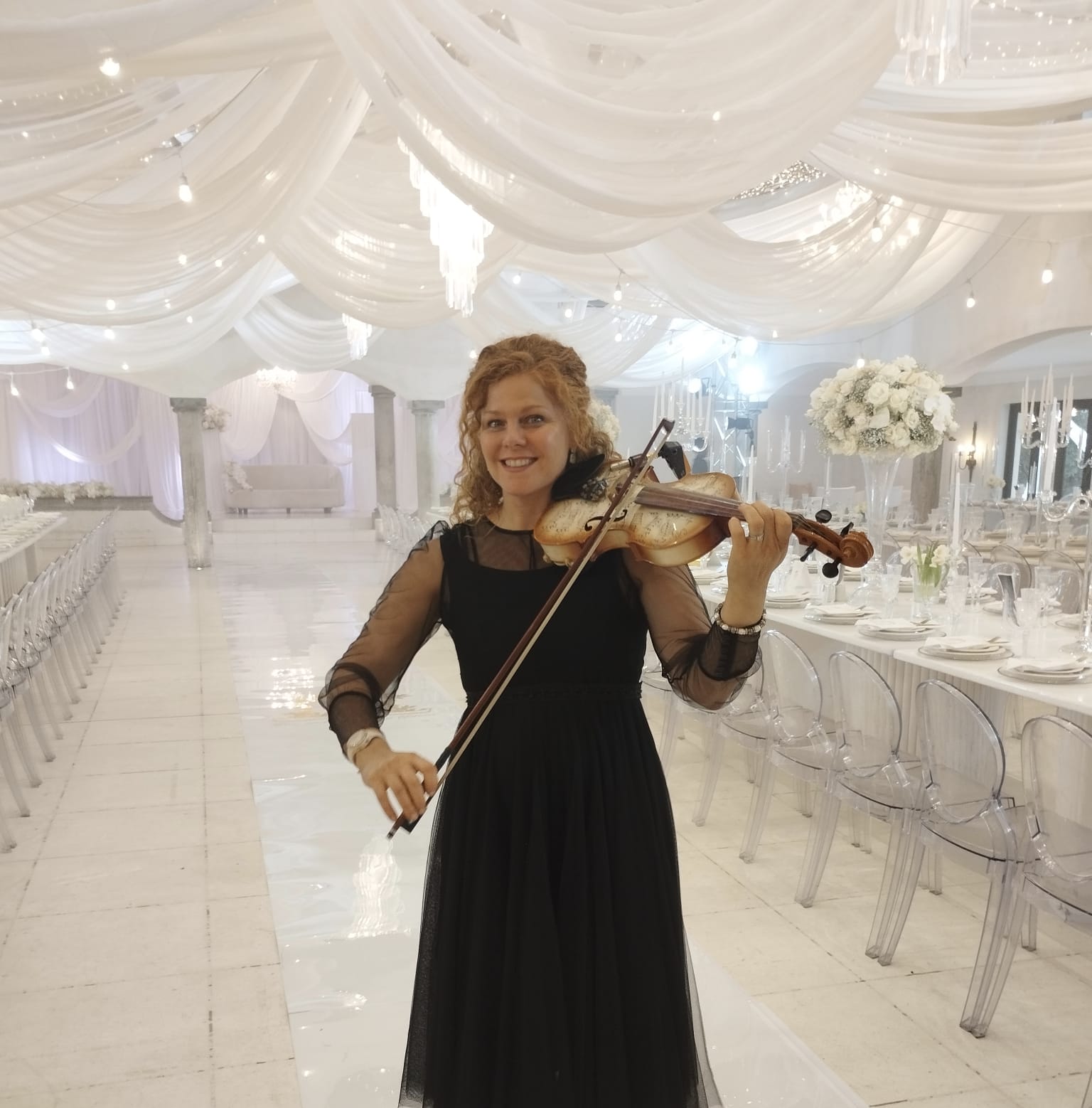 A chic, all white backdrop for a wedding at Avianto. Serenading guests on violin and playing a special song for the couple on entry.